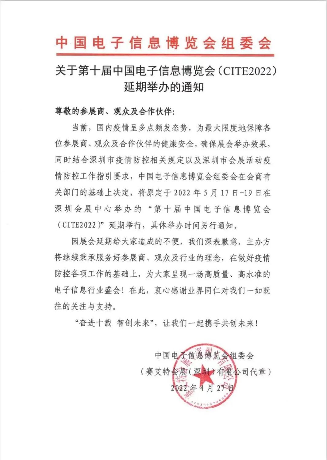 鉴于近期多地疫情变化影响,为确保参会人员的健康安全,保证展会效果,经多方沟通研判,组委会决定,原定于5月17-19日第17届中国车联网大会暨智能驾驶及汽车安全技术展将延期举行,具体举办时间另行通知。