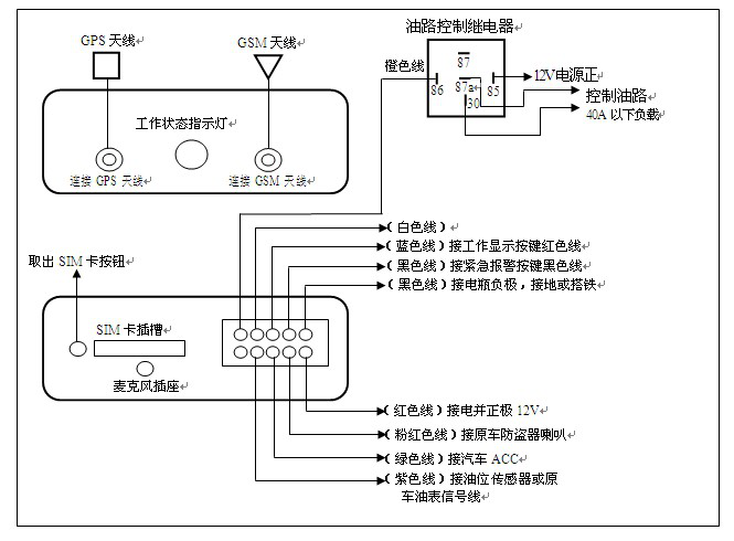 14、远程断油路:由软件系统发送指令对汽车的油电路进行切断或接通动作。用于私家车.租赁车.按揭车.押运车等需要对其行驶控制的车辆